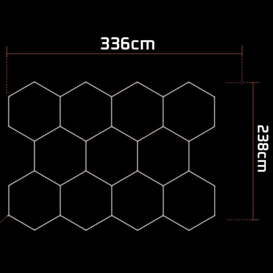 Lampa LED Hexagon o wymiarach 336x238cm i mocy 368W, wykonana z 11 sześciokątów typ S. Emituje zimne światło w temperaturze 6500K, a całkowity strumień świetlny wynosi aż 47840 lumenów. Komplet akcesoriów montażowych i przyłączeniowych w zestawie.