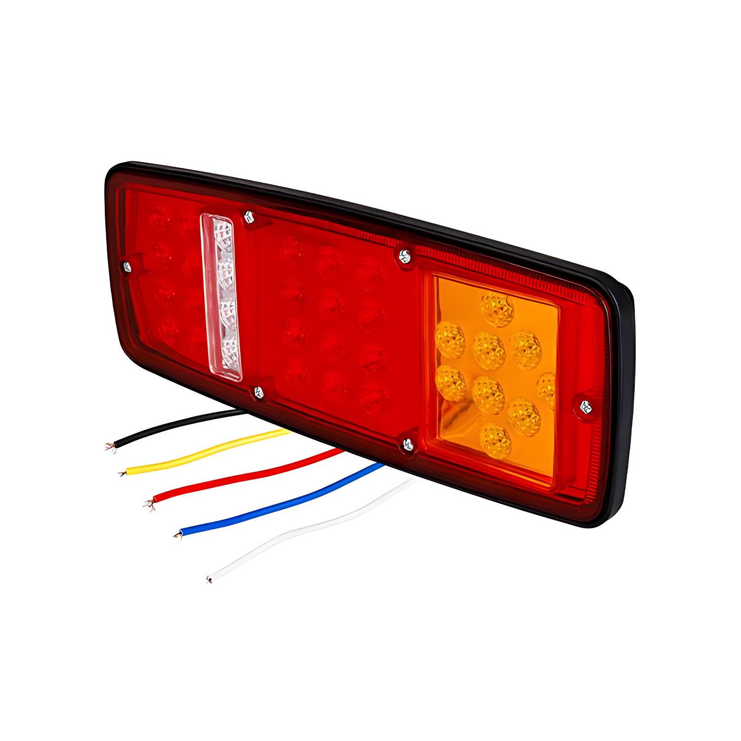 Lampa tylna oferuje kilka funkcji: światło pozycyjne, obsługiwane przez niebieski kabel, światło stop, kontrolowane za pomocą czerwonego kabla, kierunkowskaz, do którego służy przewód żółty, oraz światło cofania, obsługiwane przez biały kabel. Instalacja lampy jest prosta i bezpieczna, odbywa się za pomocą śrub montażowych, co zapewnia stabilność i pewność użytkowania. To nowoczesne rozwiązanie 4w1 sprawdzi się doskonale w każdych warunkach, oferując niezawodność, efektywność i stylowy wygląd, które z pewnością spełnią oczekiwania najbardziej wymagających użytkowników.