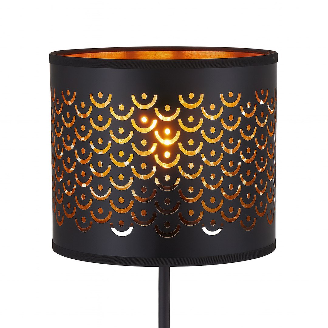 Oryginalna forma klosza lampy Morgan zachwyca zarówno przy wyłączonym, jak i włączonym świetle. Już na pierwszy rzut oka uwagę zwraca czarne, matowe wykończenie zewnętrzne, które nadaje lampie wyważonego, modernistycznego charakteru. Jednak dopiero po uruchomieniu żarówki widoczna staje się gra kontrastów. Złota warstwa wewnętrzna zaczyna subtelnie rozświetlać perforacje, tworząc atmosferę przytulności i elegancji przypominającą wnętrza luksusowych apartamentów. Finezyjne wycięcia układają się w powtarzalny, geometryczny motyw, który nie tylko zdobi, lecz także filtruje światło w sposób wyjątkowo efektowny, nadając wnętrzu głębi oraz wizualnego ciepła. Sama konstrukcja abażuru cechuje się wysoką precyzją wykonania, co w połączeniu z metalową stabilną podstawą i trwałymi materiałami zapewnia wieloletnią satysfakcję z użytkowania. Lampa świetnie prezentuje się w zestawieniu z nowoczesnymi sofami, minimalistycznymi stolikami czy przestronnymi kącikami czytelniczymi, gdzie staje się nie tylko źródłem światła, ale i centralnym punktem dekoracyjnym.