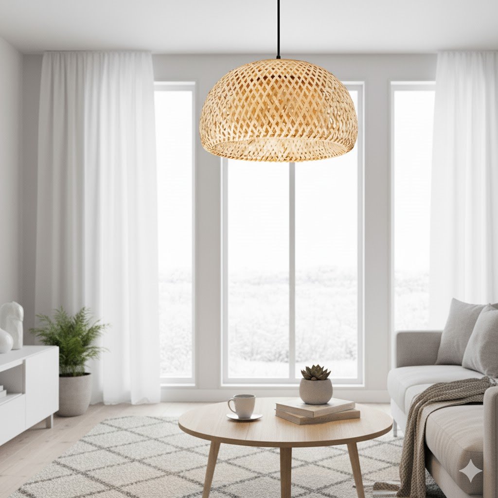 Starannie zaprojektowany bambusowy klosz lampy to prawdziwa ozdoba każdego wnętrza. Jego pleciona struktura tworzy efektowną grę światła i cienia, dzięki czemu nawet prosta aranżacja nabiera głębi i wyjątkowego charakteru. Wnętrze zyskuje dzięki niej niepowtarzalny klimat, przypominający naturalne przestrzenie inspirowane wakacjami, letnimi tarasami i spokojem domowego azylu. Lampa wisząca Boho doskonale prezentuje się zarówno jako główne źródło oświetlenia w salonie, jak i dekoracyjny akcent nad jadalnianym stołem, w sypialni czy przestrzeni rekreacyjnej. Jej organiczna forma wprowadza do pomieszczenia miękkość i prostotę, a jednocześnie stanowi mocny element dekoracyjny, który potrafi odmienić każde wnętrze. Bambus w połączeniu z czarnym przewodem i podsufitką tworzą kontrastową, lecz elegancką kompozycję, idealnie dopasowaną do współczesnych trendów wnętrzarskich. Lampa wyróżnia się także łatwością montażu oraz uniwersalnością. Pasuje do różnych wysokości pomieszczeń i bez trudu łączy się z pozostałymi elementami aranżacji.