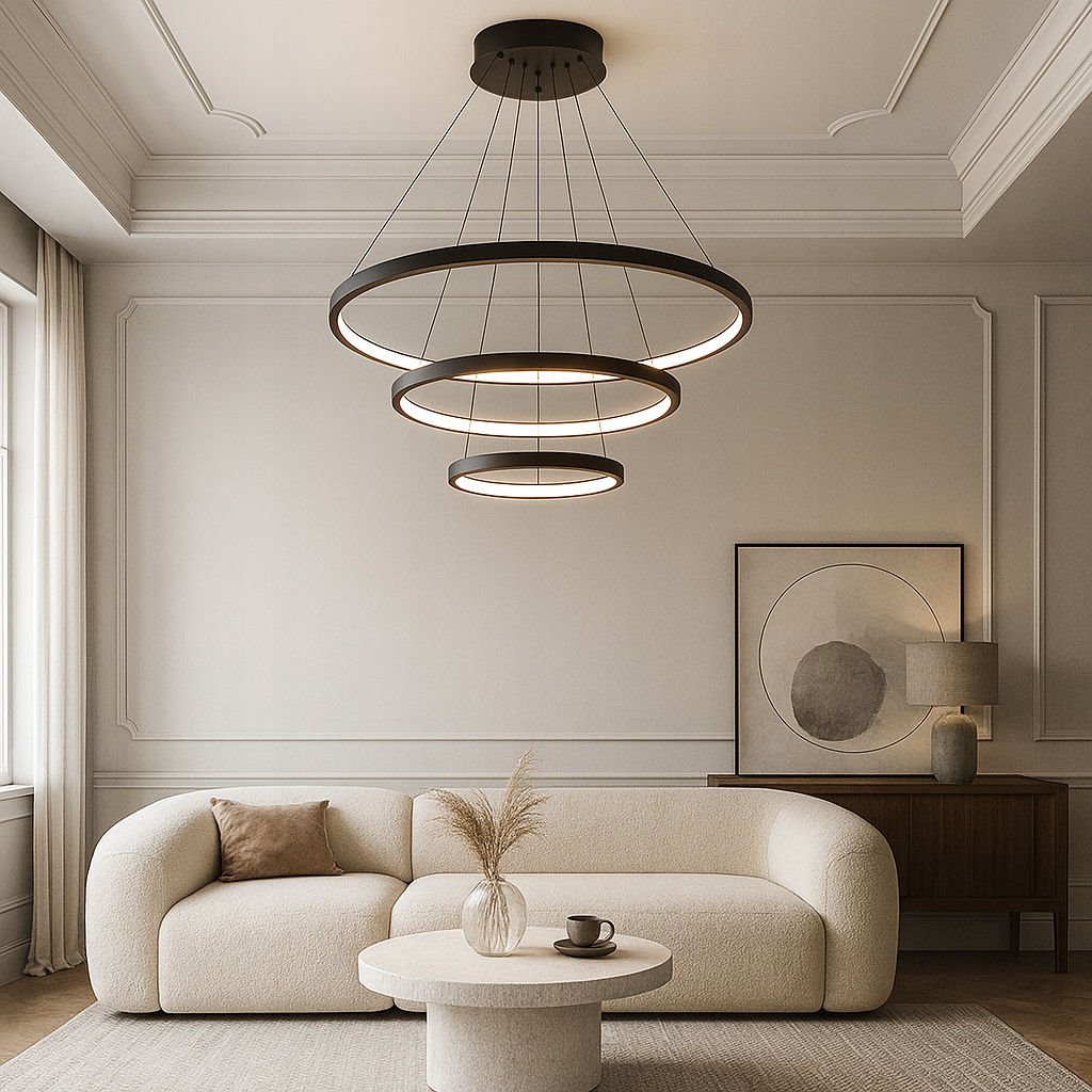Wyrafinowana estetyka i doskonałe proporcje sprawiają, że lampa wiszące z kolekcji Rings staje się centralnym punktem każdej aranżacji wnętrza. Konstrukcja oparta na trzech koncentrycznych pierścieniach o średnicach 20, 40 i 60 cm tworzy efektowną, kaskadową kompozycję, która przyciąga wzrok i nadaje przestrzeni nowoczesnego charakteru. Czarne wykończenie wykonane z wysokiej jakości stali oraz aluminium nadaje oprawie elegancji i nowoczesnego charakteru, doskonale wpisując się zarówno w stylistkę glamour, modern classic, jak i minimalistyczne wnętrza Premium. Subtelne linki montażowe nadają całości lekkości wizualnej, dzięki czemu lampa nie przytłacza przestrzeni, nawet w pomieszczeniach o mniejszym metrażu. Starannie zaprojektowana podstawa sufitowa o średnicy 240 mm i wysokości 35 mm zapewnia stabilność montażu oraz estetyczne wykończenie instalacji. Zastosowanie mlecznego dyfuzora z PVC gwarantuje równomierne rozproszenie światła, eliminując efekt olśnienia i podnosząc komfort użytkowania. Całość prezentuje się niezwykle nowocześnie, a jednocześnie ponadczasowo, co czyni ten model idealnym wyborem do salonów, jadalni, reprezentacyjnych holi, klatek schodowych oraz przestrzeni komercyjnych, takich jak hotele, restauracje czy biura o wysokim standardzie.