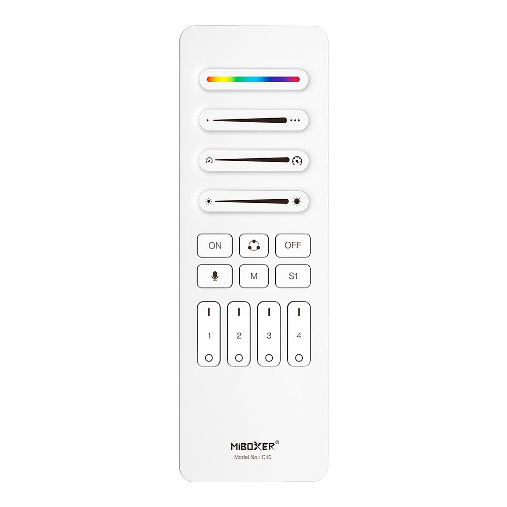 Pilot Mi Light C10 biały do cyfrowych taśm LED to bezprzewodowy kontroler radiowy przeznaczony do obsługi oświetlenia cyfrowego w systemie 4-kanałowym. Jest to pilot zasilany bateriami 2xAAA (brak zestawie), który pozwoli Ci na obsługę sterownika 4-kanałowego SPIW5-4 oraz podłączonych do niego cyfrowych taśm LED Mono, CCT, RGB, RGBW lub RGB+CCT. Łączy się on drogą radiową 2,4GHz ze sterownikiem cyfrowym umożliwiając bezprzewodową kontrolę oświetlenia. Na pilocie znajdziemy aż 6 przycisków przeznaczonych do sterowania oświetleniem, 4 podwójne przyciski do włączania lub wyłączania stref, 3 suwaki do regulacji ustawień światła, a także wielokolorowy suwak umożliwiający wybór dowolnej barwy z palety RGB. Pilot do LED cyfrowych Mi-Light umożliwia obsługę do 4 stref oświetlenia (z wykorzystaniem sterownika 4-kanałowego), a także pozwala na zapis jednej ulubionej sceny.