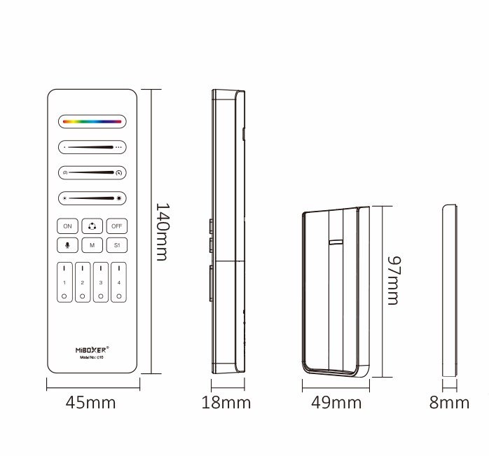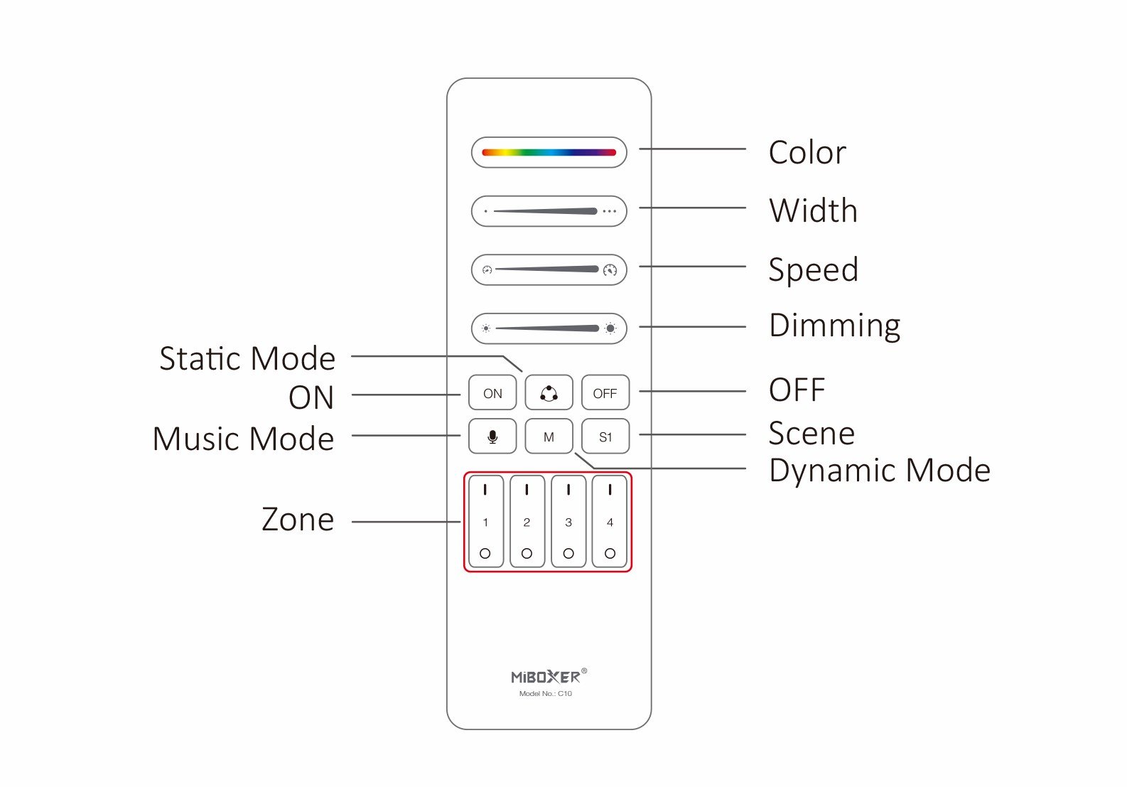 Pilot do cyfrowych LED Mi Light C10 został wyposażony w 6 przycisków sterujących, 4 podwójne przyciski do obsługi stref i 4 suwaki pozwalające na sterowanie natężeniem oraz barwą światła. Poniżej zamieszczamy rozpiskę wszystkich przycisków pilota.