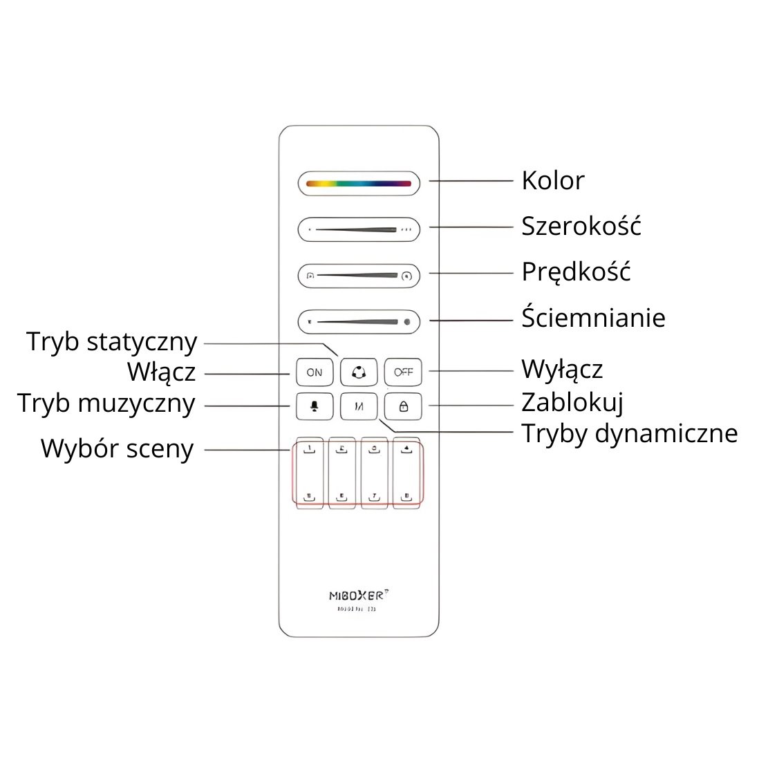 - Przycisk SHIFT - krótkie naciśnięcie powoduje zmianę koloru trybu dynamicznego, natomiast dłuższe przyciśnięcie zmieni kierunek trybu.