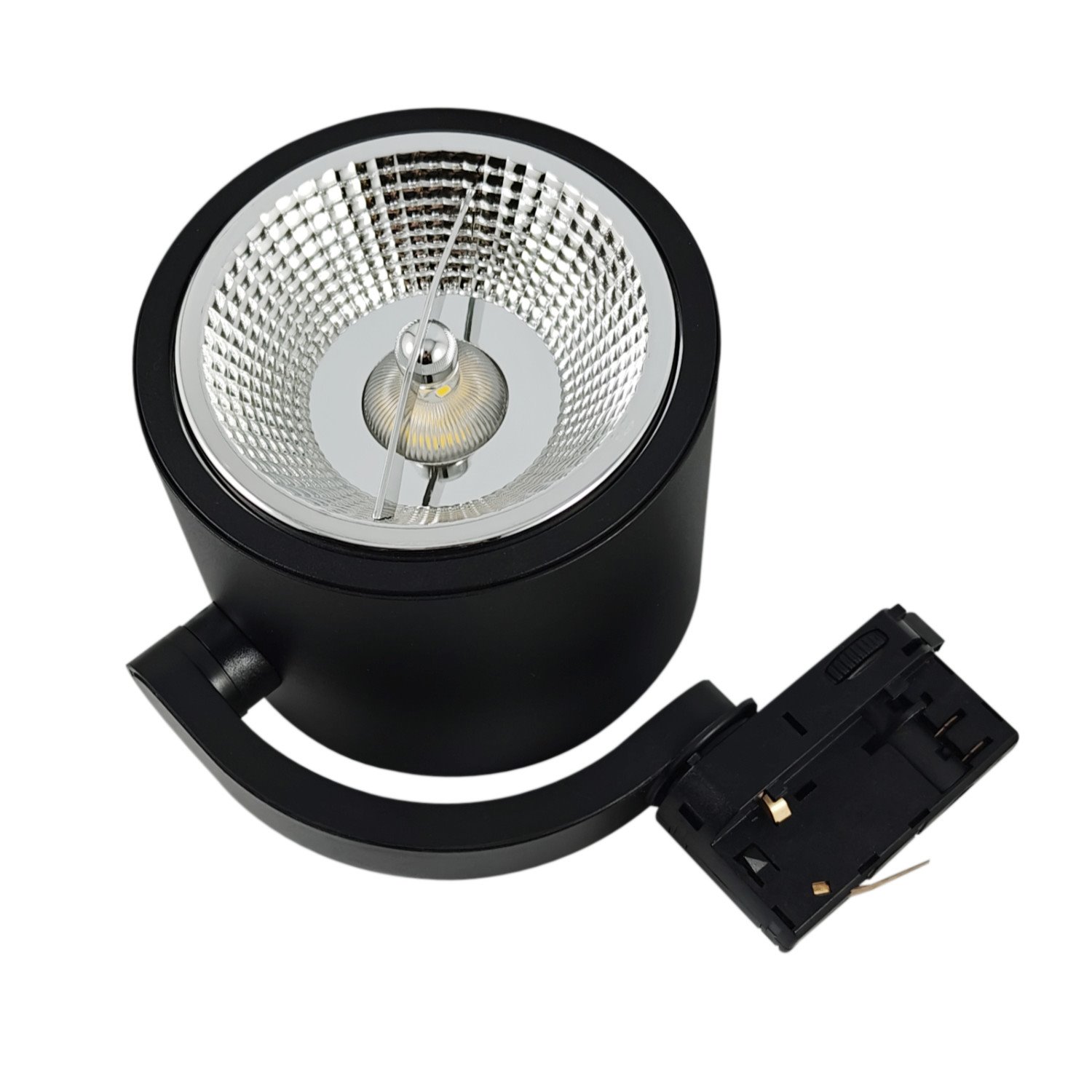 Czarny matowy reflektor szynowy ARKO na żarówkę AR111. Przeznaczony do systemów 3-fazowych. Wykonany z aluminium, regulowany w dwóch płaszczyznach. Profesjonalne oświetlenie akcentujące do domu i biura