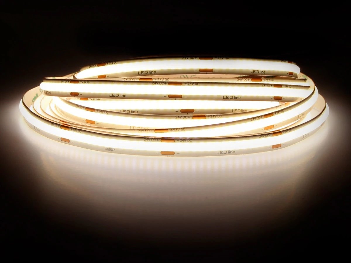 Taśma LED COB 24V o mocy 5W/m z serii Prime wyposażona w 320 LED/m. W pełni jednolita i bezpunktowa linia światła o ciepłej barwie z wysokim współczynnikiem CRI>90Ra. 5 lat gwarancji producenta.