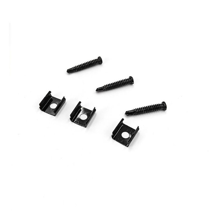 Zestaw uchwytów przeznaczony do montażu szynoprzewodów natynkowych Micro-4. W komplecie znajdują się 3 uchwyty i 3 wkręty montażowe.